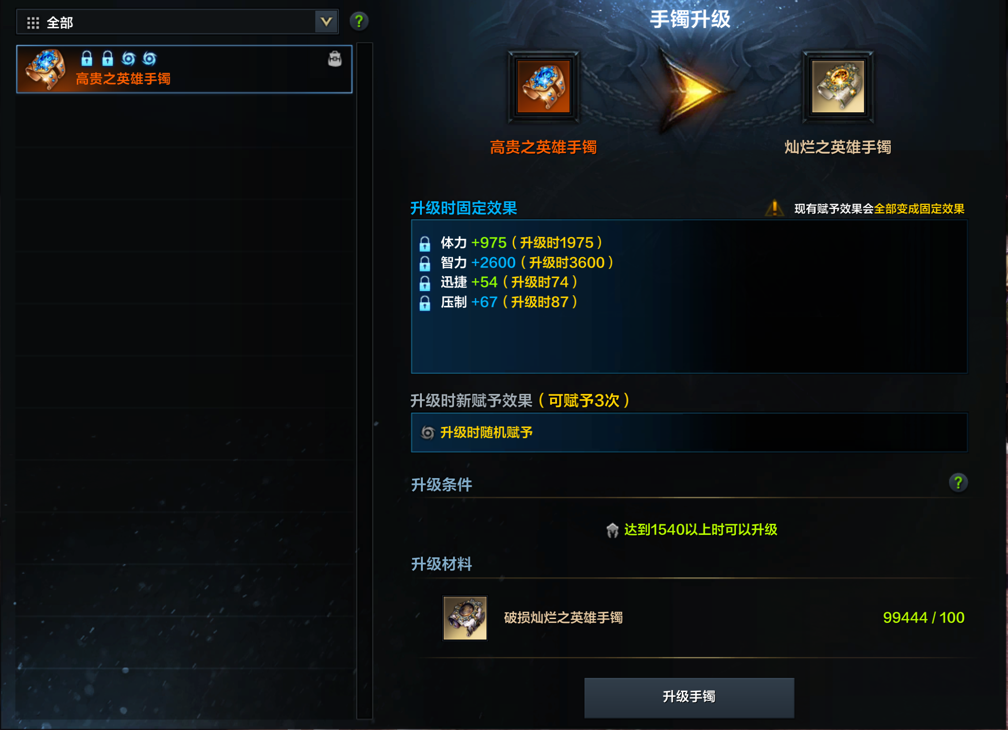 ●完成一次效果赋予的遗物级手镯可以进行升级,升级时需要消耗古代手镯的分解材料【破损灿烂之英雄手镯】。