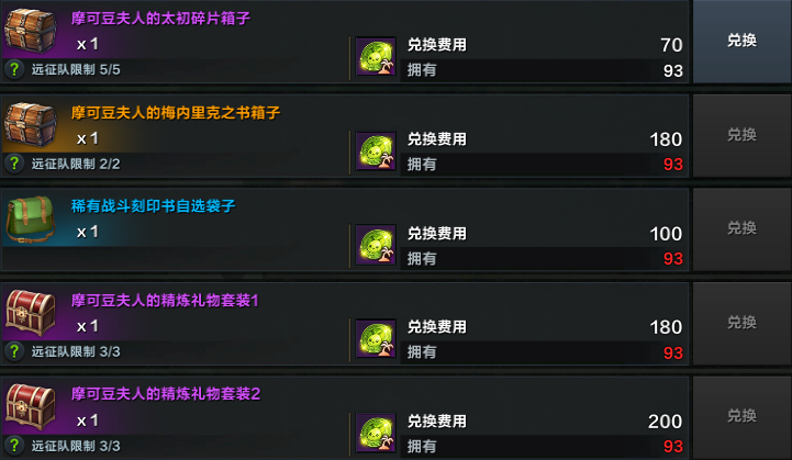 摩可豆夫人的太初碎片箱子,内含【太初碎片】*1,单远征队限制兑换5个;摩可豆夫人的梅内里克之书箱子,内含【梅内里克之书】*1,单远征队限制兑换2个;摩可豆夫人的精炼礼物套装1,内含伟大荣誉突破石(绑定)*35、破坏石结晶*350(绑定)、守护石结晶(绑定)*1000,单远征队限制兑换3个;摩可豆夫人的精炼礼物套装2,内含神奇荣誉突破石(绑定)*35、破坏强石(绑定)*350、守护强石*1000(绑定)。