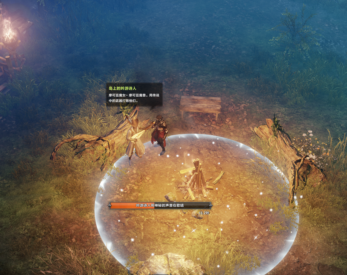 冒险家根据指引在篝火旁演奏【心潮如歌】或【森林小舞曲】,被你的音乐造诣所感动,系统角色【岛上的吟游诗人】将摩可豆英雄的故事唱给冒险家听。(冒险家可以带上耳机欣赏咱们吟游诗人的美妙歌声哦~)