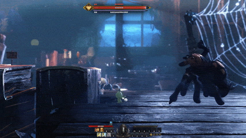 冒险家在阴森棚屋需要使用弓弩,用Q技能【前方发射】击败怪物,利用W技能【顶部发射】消灭上方的蜘蛛和蜘蛛卵。