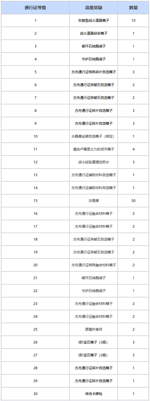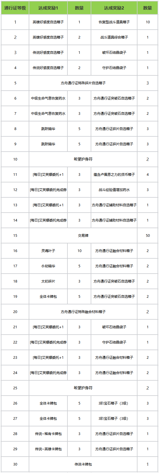 在本次通行证奖励中,完成任务提升通行证等级就可以获得达成奖励,包含有大量强化材料、好感度箱子、希望护身符、交易牌、宝石箱子和传说卡牌包等丰厚的道具奖励免费得。