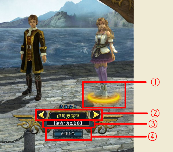 区域1:选择人物性别后会在下方显示黄色光环;