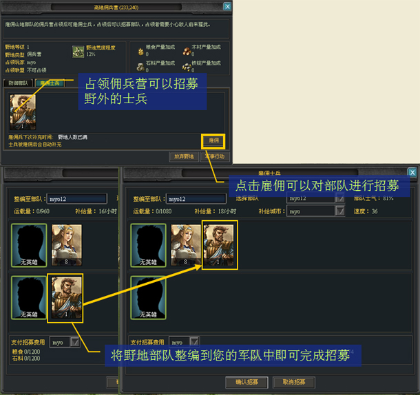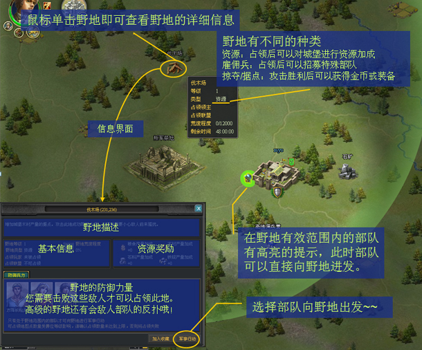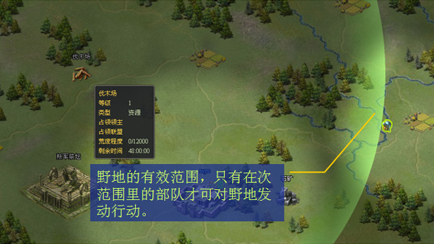 野地会随机出现城堡的周围,您可以看到地图上所有的资源类野地,而其它类型则需要侦查城堡才可看见。