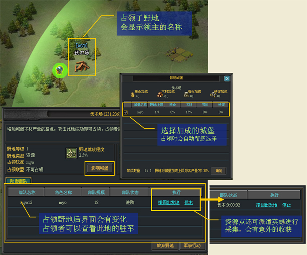 资源类:资源加成,攻击胜利后部队会自动驻防占领该地,占领后可持续为玩家城堡增加每小时资源产量(最多24小时)