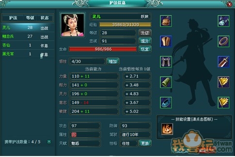 1护法角色基础属性 1)姓名:护法的姓名。(不可以修改) 2)经验:护法的当前经验和升级所需经验,可用于升级和学技能。(手动升级) 3)等级:护法的等级。 4)忠诚:影响护法的行动。(低忠诚度护法不听命令行动) 5)攻击:武器装备提升的伤害力。 6)防御:防具装备提升的防御力。 7)力量:护法的武术攻击力。 8)耐力:护法的武术防御力。 9)灵力:护法的法术攻击力。 10)意志:护法的法术防御力。 11)敏捷:护法的攻击敏捷。(敏捷快的先攻击) 12)生命:护法的生命上限和当前生命值。 13)性格:影响护法的五个基本属性(力量、耐力、灵力、意志、敏捷)的高低。 14)悟性:影响护法的五个基本属性和生命的成长数值。(悟性越高成长越好) 2、护法角色社会属性 1)属性:风、火、水、土、雷和无属性。其中水克火,火克雷,雷克风,风克土, 土克水,无属性不克谁也不被克。属性会影响攻防加成。 2)种族:人、妖、仙。 3)驾驭:要求主人的道行必须高于这个设定才会听命出阵战斗。 4)天赋:护法先天具备的一个被动技能,不占用战斗回合数,出场战斗就有效。 3、 护法角色装备属性 1)攻击类道具框:武器、法宝(2个)、戒指、项链;提供基本攻击力的道具备。 2)防御类道具框:衣服、帽子、披风、护腕、鞋;提供基本防御力的道具装备。 4、 护法角色状态属性 1)出战:可以为主人出场战斗,忠诚度小于60时不能出阵。 2)休息:不出场战斗。 3)携带上限:可以携带的护法上限数量(在3-10之间)。 4)出阵上限:一场战斗中可以出场战斗的护法上限(在1―3之间)。 5、 护法技能属性 1)参战护法技能使用设定:被动技能种类+主动技能种类≤4