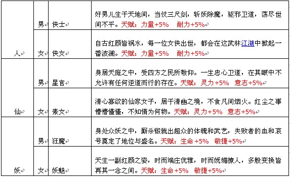 人族: 历尽万物苍生,唯有人族应道而兴,尔来已有千年。虽被生老病死所困、也无广大神通。然其生生不息,其中亦有风云杰出之辈。使得人族雄踞四大部洲,成为众生之首。 特点:拥有平衡的武术攻防能力。天赋:力量+5% 耐力+5%。 仙族:自天劫落定,仙班重列,圣人按定天伦。再经数千载,成就今日之仙族。仙族者,身怀莫大神通,但生性淡泊,不黯世情。故此仙人往往寡情薄欲,却也因此得以专心修道,心无旁骛。 特点:仙术神通,不屑于纠缠战斗。天赋:灵力+5% 意志+5%。 妖族:上古一战,妖皇帝俊身死,洪荒妖族尽数陨落。侥幸偷生者化身人、兽、草木、精怪,历经千载光阴,既成为当今妖族一脉。妖族以强者为尊,其意志之顽强,实力之强健,放眼天下无出其右者。 特点:超强的体力,速度极快。天赋:生命+5% 敏捷+5%。 |