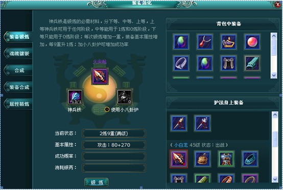 1)、装备锻炼:是强化装备的一种手段,任何装备上的基础攻击和基础防御,都可以通过锻炼得到强化,提升装备该装备的护法能力。 将要强化的装备放置在锻炼位置,如果拥有神冰铁这个道具就可以进行强化。装备锻造的过程中,有一定的几率会失败掉级,在锻炼过程中使用小八卦炉,锻造失败后会自动使用一个代替掉级。