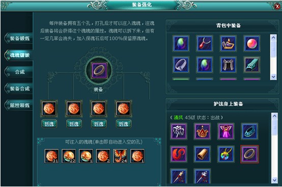 2)、魂魄镶嵌:装备上可以进行打孔,有孔的装备可以注入魂魄。魂魄主要在洞府的六道轮回中获得。不同的魂魄,功效是不同的。需要玩家进行摸索。 3)、合成:一些高级锻造材料需要低级的来合成。合成界面可以完成这个功能。