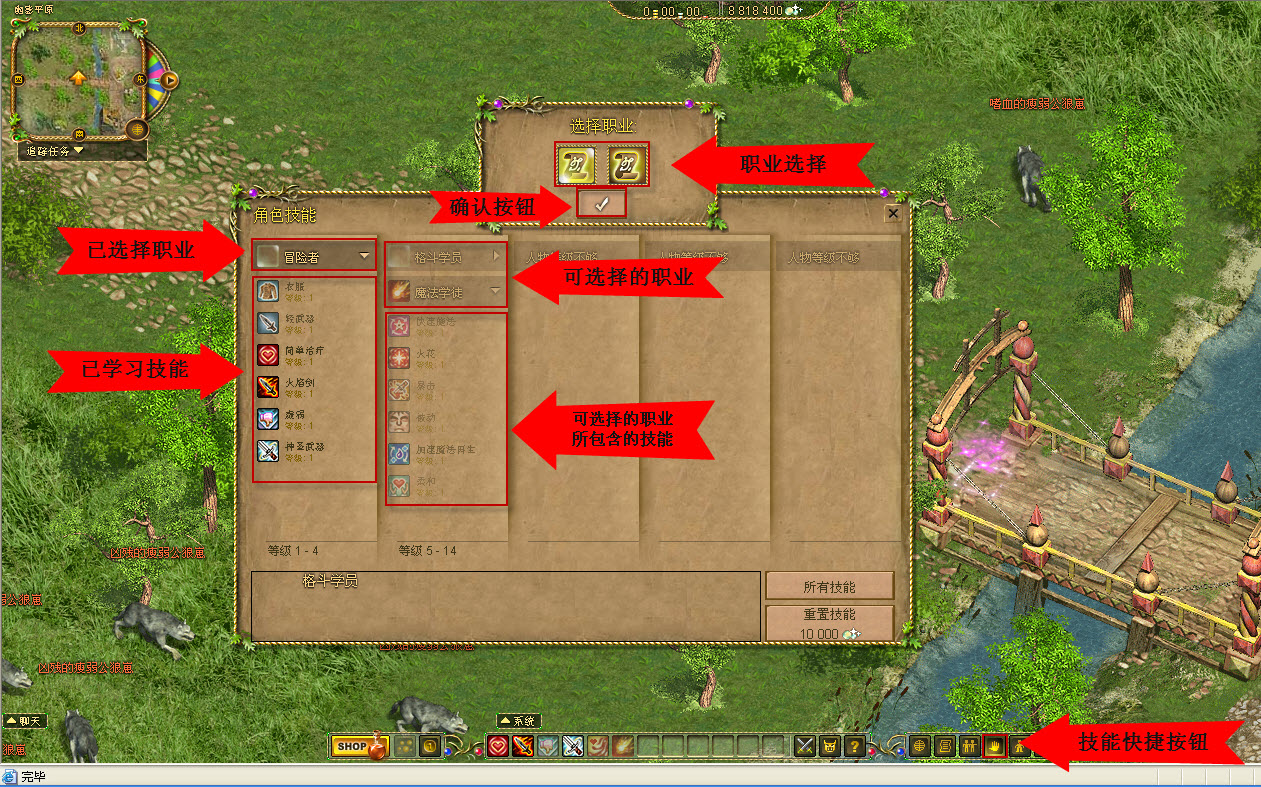 当角色等级达到“可选择职业”的要求时,将鼠标光标移动到“技能快捷按钮”并点击打开“职业技能栏”,如确定所需职业,只需将鼠标光标移动到“选择职业框”中选择并点击 按钮确认即可。