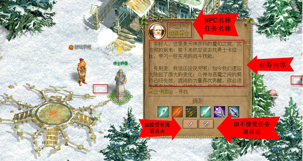2、接受任务:玩家可根据任务情况选择接受任务或不接受任务,可将鼠标光标移动到(表示接受)或(表示不接受)并点击。
