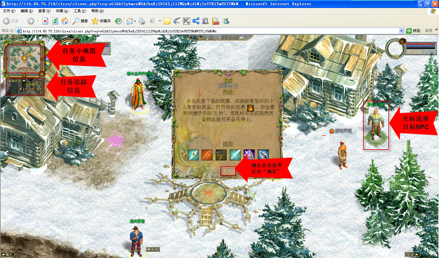3、结束任务:当完成任务后点击NPC后随即出现任务提示栏,将鼠标移动到 并点击即可结束任务。