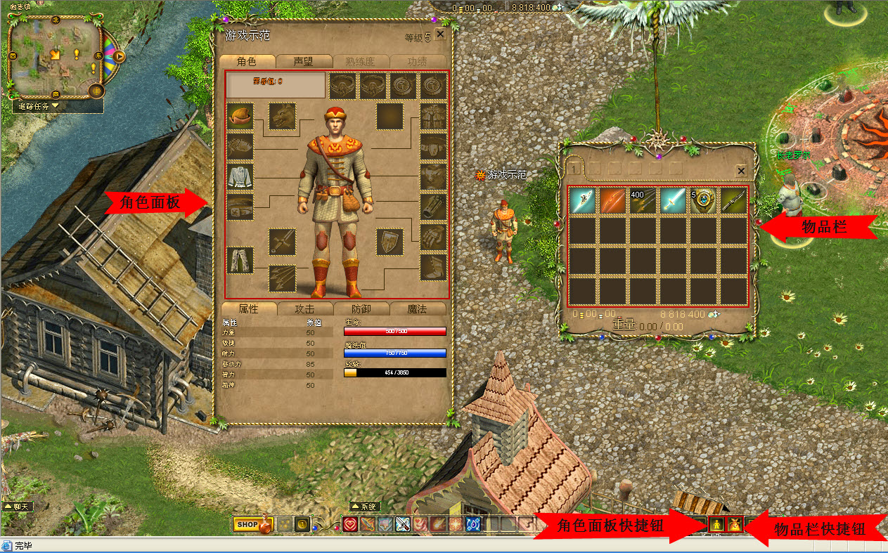 方法二:打开角色面板、物品栏,将装备选中后移动到角色面板即可。
