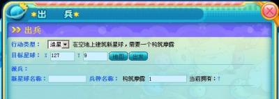 建筑分星球,需要消耗1个构筑摩露。在出兵菜单中,选择“造星”或者在宇宙地图选择无人区,点击创造星球。如下图: