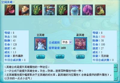 | 合成条件: 1.合成的主、副英雄必须是“空闲”状态 2.合成主英雄至少达到8级 合成步骤: 1.将主英雄放入合成栏内(合成后不会消失,且获得属性提升) 2.将副英雄放入合成栏内(合成后为主英雄提供属性加成,并且副英雄连同身上的装备一同消失) 3.然后选择您要加成的属性(速度、攻击、生命或防御) 4.点击合成按钮后即可进行合成