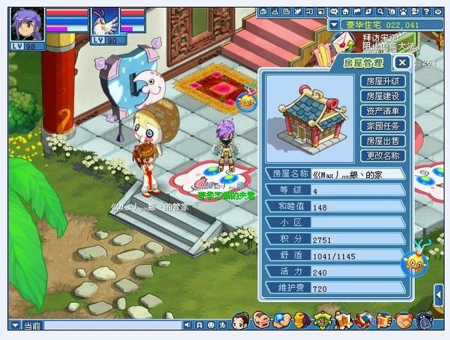 玩家可以在这里看见自己家园的积分、舒适度、活力值,以及维护费,除了这些,我们还可以通过这个页面来管理自己的家园~~~~~