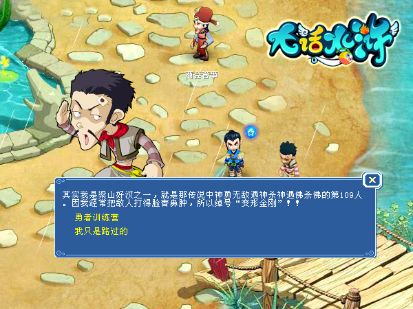 NPC:其实我是梁山好汉之一,就是那传说中神勇无敌遇神杀神遇佛杀佛的第109人。因我经常把敌人打得鼻青脸肿,所以绰号"变形金刚"!!
