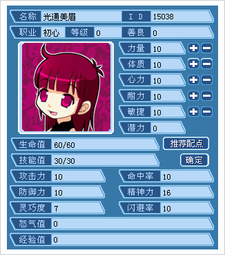 推荐配点: 玩家可以按照系统给出的优化方案来自动分配潜力点,如果想创造些另类的角色,例如防御狂人,攻击超高但会被怪一招秒的角色,还是自己选择潜力点分配吧。