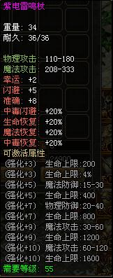 法师的紫电雷鸣杖,中毒闪避:+20%,生命恢复:+20%,魔法恢复:+20%,中毒恢复:+20%