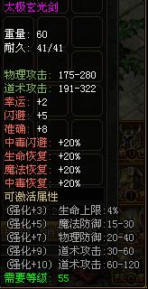 道士用的太极玄光剑,中毒闪避:+20%,生命恢复:+20%,魔法恢复:+20%,中毒恢复:+20%
