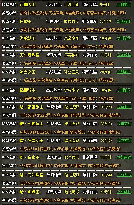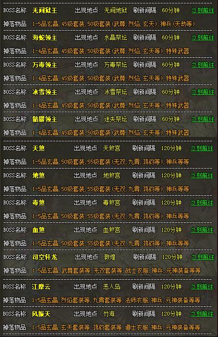 BOSS刷新点: 《龙城》中什么资源最稀缺?对的,你没想错,就是那些平日让人胆战心惊的BOSS们。游戏中的这群玩家们太疯狂了,BOSS已经阻止不了这群玩家了... 可惜BOSS的数量总是与玩家的愿望不符,若在游戏中可以轻松掌握BOSS的刷新与地点,那么无疑将帮助玩家们更加轻松的去收割这些强大的存在。 《龙城》游戏中的活动帮助虽然能够给玩家以帮助,但那毕竟只是一部分的BOSS,大部分的内容还需要靠玩家们自己探索咯,这里有一个小窍门,游戏中的雷达地图可以帮助你迅速找到BOSS的刷新点。 《龙城》游戏中的各类BOSS让玩家们又爱又恨,爱他们提供丰富的资源与装备,恨他们稀少的数量与强大实力,《龙城》游戏中数量众多的BOSS给你最愉快的游戏体验。 下面就是一些BOSS经常出没的地方和刷新时间,希望能给大家一些参考 普通BOSS: