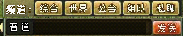 综合频道:可以看到一切与您相关的信息以及大家所在综合频道里面发的信息 公会频道:所在公会里的人可以看到的信息 组队频道:所在的队伍里的人可以看到的信息 世界频道:可以看到所有玩家的在世界频道发的信息 ****:只有和您聊天的人可以看的到的信息 您还可以畅所欲言,点击普通,您想在哪个频道发言都可以的,写好您想说的话之后点击发送就可以在您所在的频道就可以看到您所说的话了哦