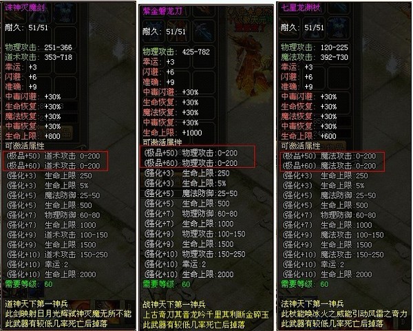 积分武器极品60可激活属性:增加攻击200