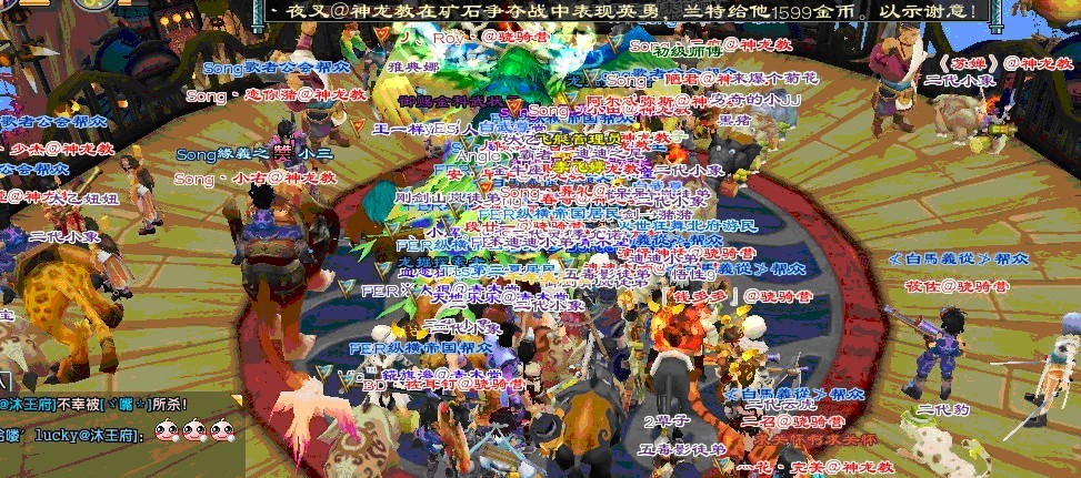 接近8点,皇城派出一小分队刚走出城门,就发现歌城已经有一个队在角落使用冥界之门正在拉本城城员,于是皇城立刻冲上前,进行剿灭。本以为已将提前到达皇城的歌者城员清光,没想到更多的歌城人员集结在一个向下凹的地形,两城的首次碰撞,导致小记的电脑,直接卡屏啦!下面是小记的冒死截图哦!