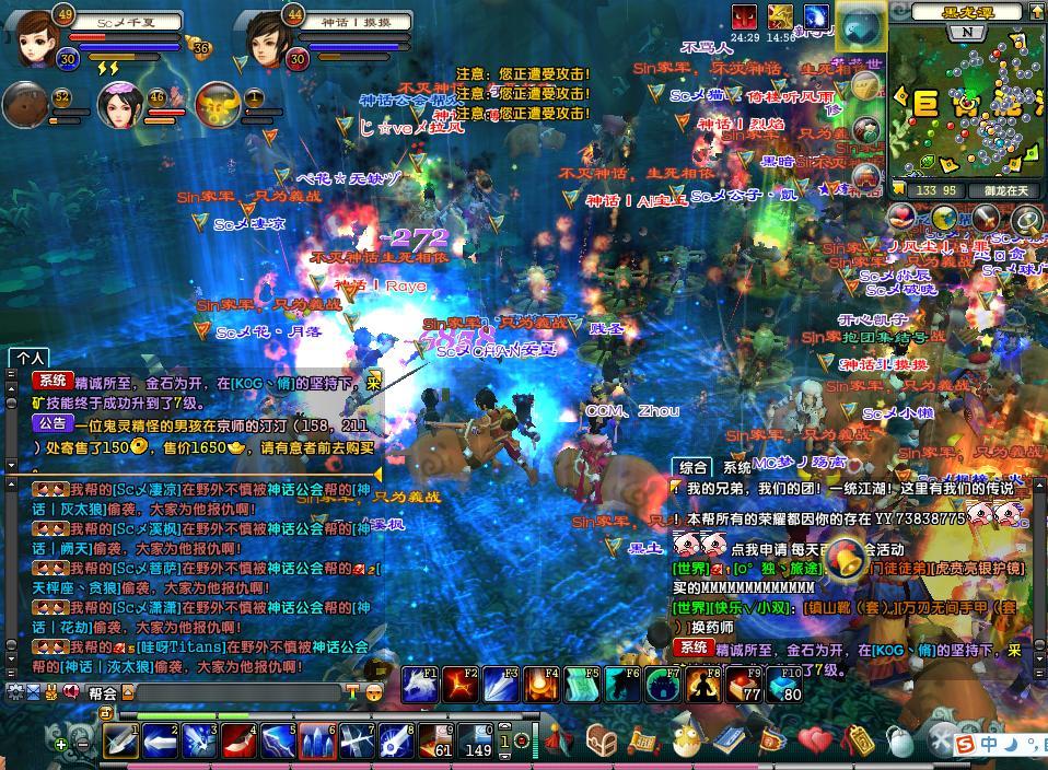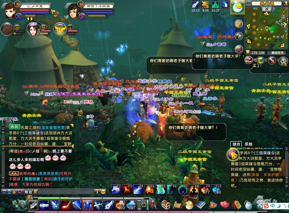 记者:法拉第稿件类型:实况报道发稿时间:2001-07-24 7月23日神话公会与SinCity举行了一次大规模军事行动。这是自后内测两大公会第一次正面对决,也是内测十大军团的第一次正面对战。然而此次对决没有任何谩骂、刷屏、以及不和谐,两大同阵营公会,和和气气的举行了一次联合军事演习。 17点30分,两方协商在17点50在黑龙潭巨骨泥潭对决。20分钟集结时间,神话公会集结并出动130+人,而sc方面出动了150+人。Sc由哀牢山进入黑龙潭,神话由扬州进入。现场实录: