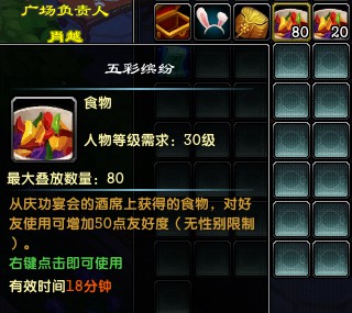 20个庆功宴席,可以出产100个五彩缤纷,每个五彩缤纷+友好度50(无视性别哦,想结拜的也可以来这招)5000友好妥妥的够了。这个宴会有效时间是30分钟,五彩缤纷的有效时间是20分钟,其实还可以在庆功宴上一边刷衣服一边刷友好,小伙伴越多时间越快,人多力量大,可以轮流开,东西不会在结束时消失,有效时间内皆可。 费用:开宴会场地费80+20个庆功宴席*8=240金!只要240金,只要20分钟!对,你没有看错,只要240金,只要20分钟!小号仓库带回家,再也不用无聊的刷友好,再也不用费时费力,不需要去下载任何软件,240金对于老区来说简直不值一提,随便卖个钻就行,还犹豫什么?有要和小号结婚的速度试试这个方法吧!