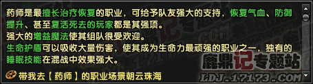 药师,传统的治疗类职业。顾名思义,给队友加血制药无疑是首要任务。而拥有药石、回天、洗髓三系技能,药师成了目前也是唯一可以给自己和队友增加抗性的职业,甚至还能够暂时免疫不良状态!可以预见的将来,作为一个强大的后勤力量,药师的受到大家的欢迎可以说是必然的