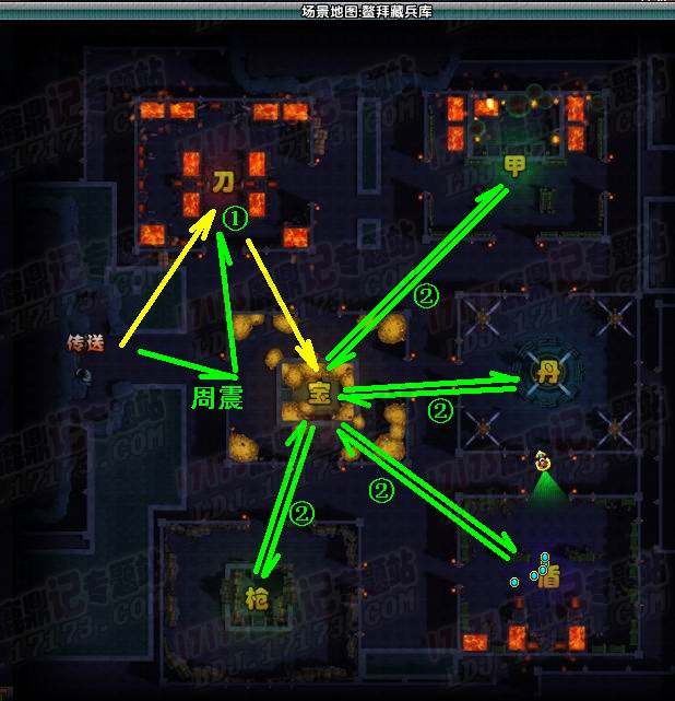 首先5个人去"刀"位置,另一个人去"宝"位置将BOSS"周震"引来"刀"区域