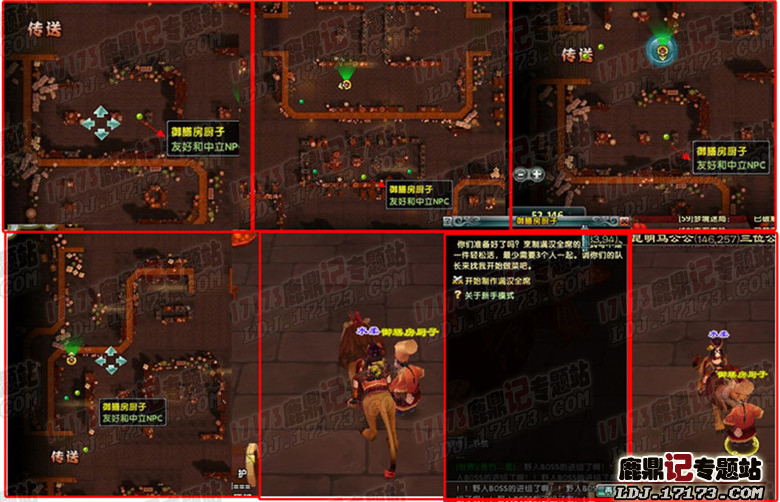 队伍进入御膳房后,需要在这里面寻找一名御膳房厨子,与其对话后进入宫廷厨房尚膳监开始筹备膳食。 这个厨子一般是系统随即刷出来的,在地图上表现为浅绿色的小点,队长点组队跟随模式后多跑跑也可以找到的,要不就守株待兔的蹲以前的刷点守。找到厨子后,队长点击对话,然后出现对话框,点"开始制做满汉全席",全队会被传送进宫廷厨房---尚膳监。