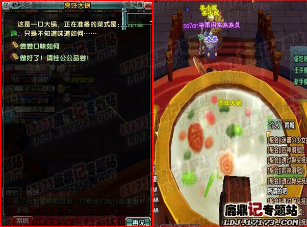 副本内有一口大锅,玩家可以通过品尝大锅内所做的菜来了解当前各种材料添加量与所需量的比例。玩家添加的材料越接近所做菜的需求数量,所做出菜的口味越好,不足或超量,均会使口味下降。每种材料的搜集量与所需量完全一致时,可获得最完美的口味。