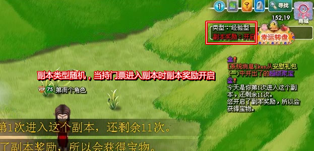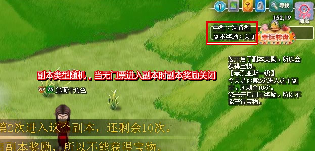 副本类型:材料型,宝石型,经验型,宠物型,装备型副本奖励:不同副本奖励不同 材料型:怪物会随机掉落材料,BOSS掉落较高品质材料。 宝石型:怪物掉落各种属性宝石,BOSS怪除了掉落宝石外,额外掉落一个宝箱。 经验型:杀死怪物会掉落人物经验书。 宠物型:怪物会随机掉落某种宠物蛋、宠物经验丹、宠物鉴定书、宠物蛋糕。(宠物的品质小概率比野外捕捉的好)。 装备型:怪物掉落各种品质装备、炼金石,BOSS有几率掉落强化宝石。