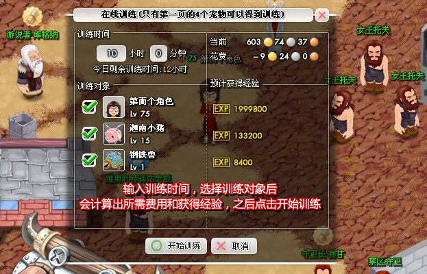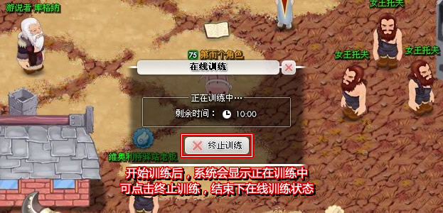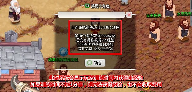 结束在线训练时,系统提示历时时间、获得经验和花费金钱数值