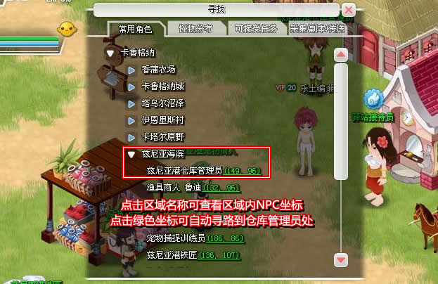 点击区域名称可查询区域内仓库管理员坐标,点击坐标可自动走到仓库管理员身边