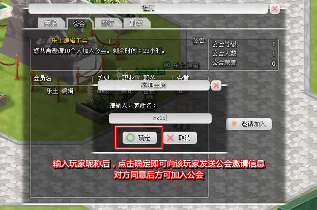 输入玩家昵称,点击确定,对方同意后方可加入公会