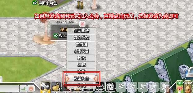 邀请周围玩家加入公会,只需要点击对方人物信息,选择邀请入会即可