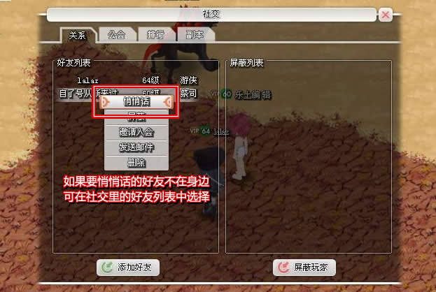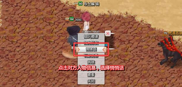方法1:当玩家在身边时,点击对方人物信息,选择悄悄话即可