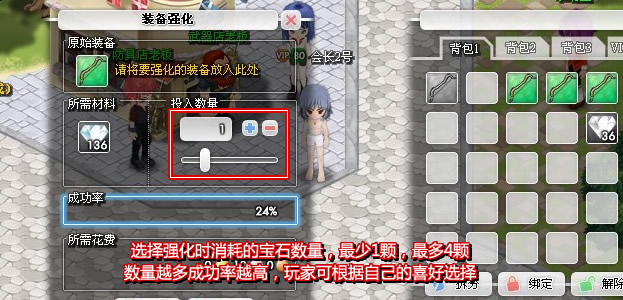 | 放入一定数量的强化宝石来提升成功率,最少1颗宝石、最多4颗宝石。 |