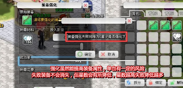 | 强化是有风险的,失败会降低装备星数,但装备不会消失 |