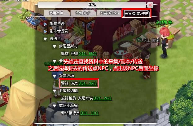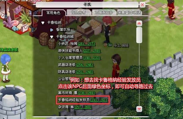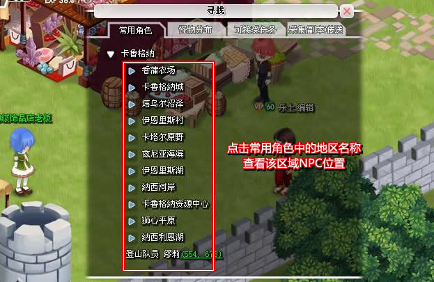点击常用角色中的地区名称,查看该区域内所有NPC坐标
