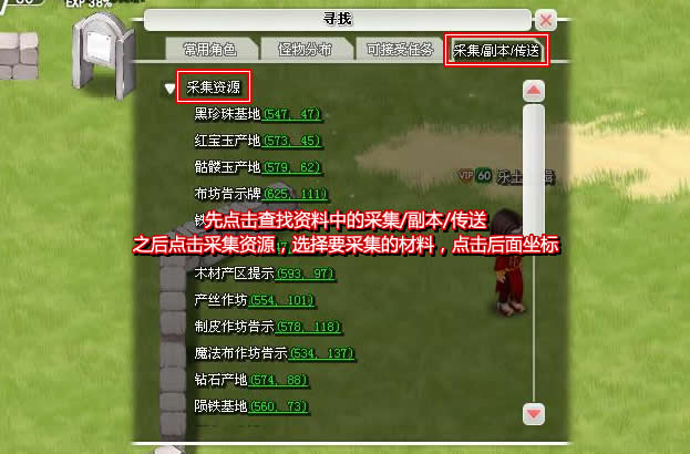 点击采集/副本/传送,之后点击采集资源,选择要采集的材料,点击后面坐标