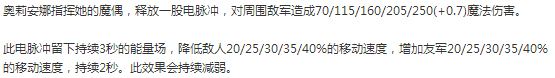 发条辅助的主要消耗技能。W的范围减速效果瞬间触发,会使得对方补刀的ADC非常不爽。减速很容易使对方ADC走位不及被我方ADC消耗。W有着很高的AP加成,配合Q技能可以在远距离造成AOE伤害。