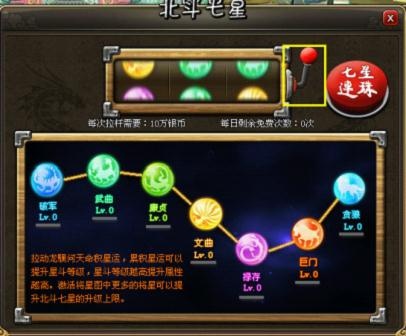 3.获得星运 拉动龙�c(fan)即可开始问天命,拉动一次需要消耗10W银币。VIP4以上的玩家可以使用七星连珠功能,一次问天命50次。