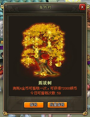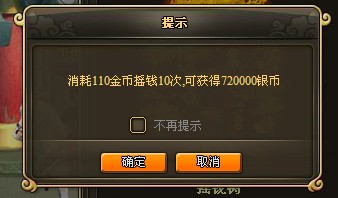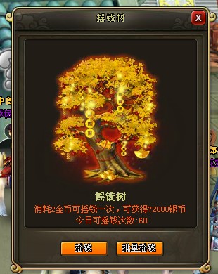 鼠标点击“摇钱”按钮即可摇钱,消耗少量金币,换取大量银币。