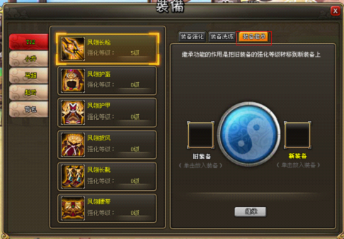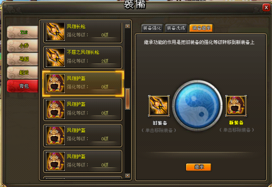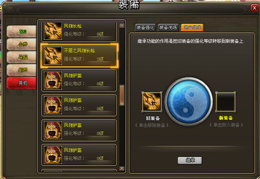 点击选择旧装备,旧装备必须是强化过的装备,没有强化过的装备无法用于继承