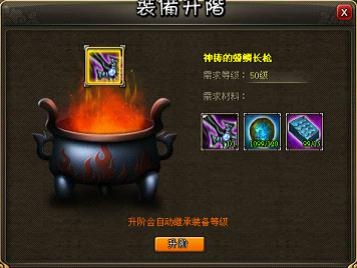 三、升阶规则 1.只有部分特殊的装备可升阶,装备升阶会消耗一定数量的普通材料和特殊材料,升阶成功后原装备会消失。 2.装备升阶成功后会按照继承规则保留原装备一定的强化等级。 3.升阶成功后的装备会完全保留原装备的附加属性的种类、数值和武器技。 4.升阶成功后的装备会完全保留原装备的天赋石。 5.升阶后的装备不再属于原来的套装,无法和以前的套装组合形成套装效果。 6.升阶后的装备品质会提升,基础属性和每次强化提升的属性都会增加。 7.升阶会提升装备的品质,提升后的装备的名称会增加前缀如“神铸的”。 |