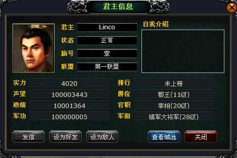 9、查看君主信息:可以获得该城君主的大致信息。并且可以执行图示几种命令。