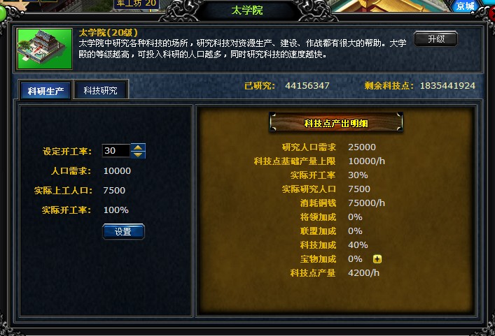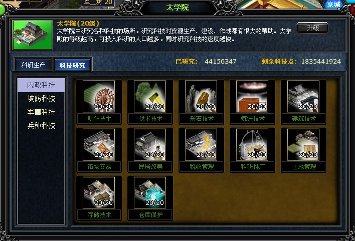 研究科技需要在太学院进行。研究科技不光要消耗资源,还要消耗科技点。科技点的产出与太学院的等级和军事的智谋值有关。研究科技对建造建筑、训练军队、军事作战等方面有很大帮助。科技发展的等级越高,效果和威力就越强。 科技研究的成果在玩家的各城池都会体现。